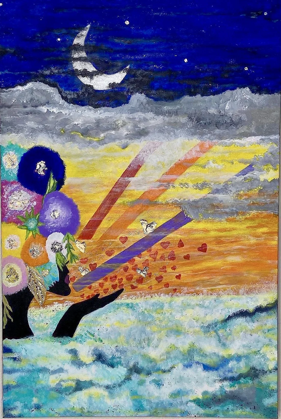 Acrylic paints with recycled copper hearts accents and colored foil